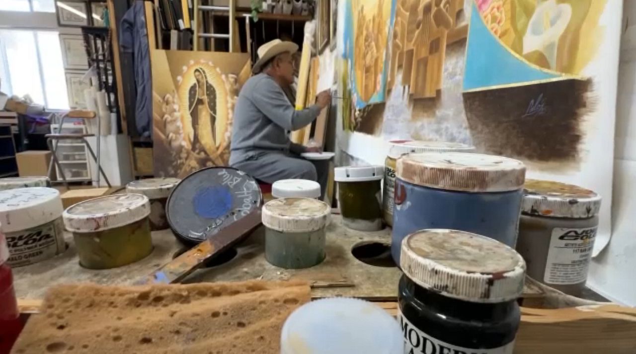Lalo García pinta una imagen que conoce desde niño: la Virgen de Guadalupe.