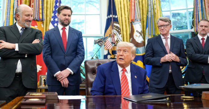 Sin embargo, los líderes de ambas naciones elogiaron el marco en anuncios conjuntos el jueves que invocaron la profunda relación entre sus países. Hablando desde la Oficina Oval y con el primer ministro Keir Starmer de Gran Bretaña en altavoz, Trump lo calificó de «gran parte para ambos países». El Sr. Starmer lo llamó un «día histórico realmente fantástico» e invocó una de las figuras históricas favoritas del Sr. Trump al señalar que era el 80 aniversario de Winston Churchill que anunció la victoria en Europa en la Segunda Guerra Mundial.