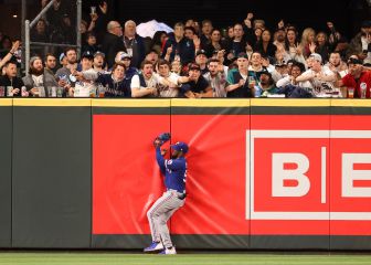 El cubano José Adolis García, número 53 de los Vigilantes de Texas, atrapa una bola que evita un home run de JArred Kelenic, de los Seattle Mariners, ante la incredulidad de los aficionados locales. La acción tuvo lugar durante la octava entrada del partido de la Grandes Ligas de Béisbol (MLB) disputado en el Parque T-Mobile de Seattle, Washington.