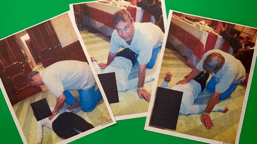 Imágenes de un documento publicado por el Departamento de Justicia, muestran al ex príncipe Andrés, inclinado sobre una persona no identificada. (Foto AP/Jon Elswick)