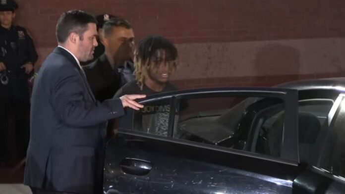 En imáges se ve a Damion Comager e Ivana Paolozzi saliendo del cuartel policial 44 esposados durente la noche del lunes.