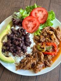 rewrite this title Comida de las 12: Arroz, habichuelas, carne de res mechada, ensalada y aguacate