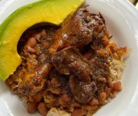 rewrite this title Comida de las 12: Concón con habichuelas, pollo guisado y aguacate