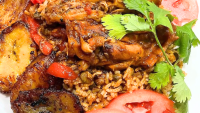 rewrite this title Comida de las 12: Locrio, pollo y maduros