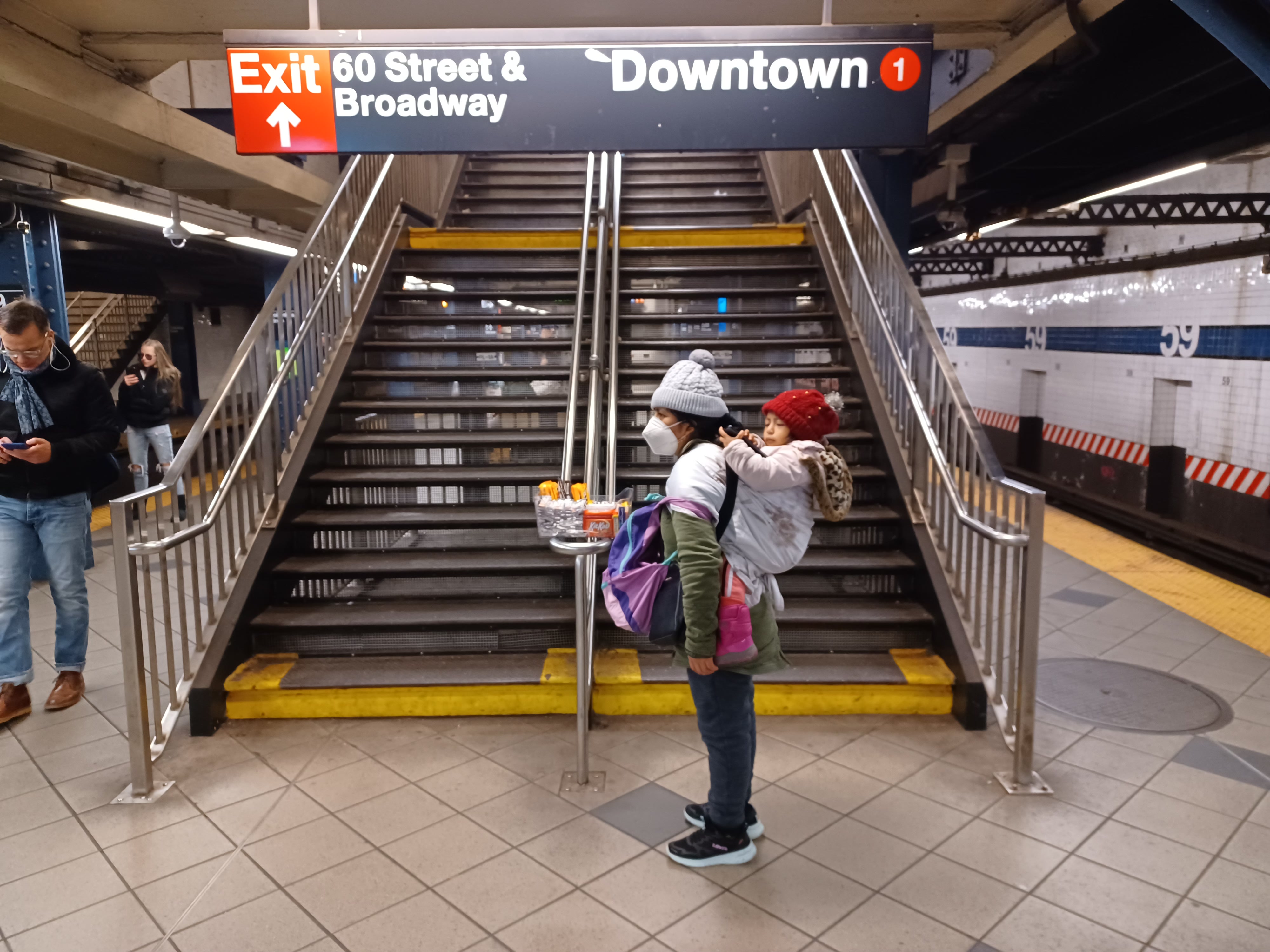 “Lo que pasa es que el papá ha ido a buscar trabajo y no encuentra. Vivimos en un albergue. Tenemos que hacer algo, aunque sea para comprar el desodorante y las cosas de higiene personal. He buscado trabajo en limpieza, aunque sea unas horitas y no consigo. Él está inscrito en la escuela en tercer grado. Pero hoy no quiso ir. Está muy apegado a mí”, comentó una migrante hispana, quien vendía agua embotellada en la entrada de la estación Columbus Circle en Manhattan, con la ayuda de su hijo.