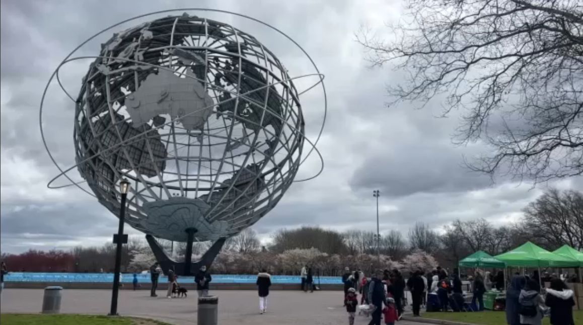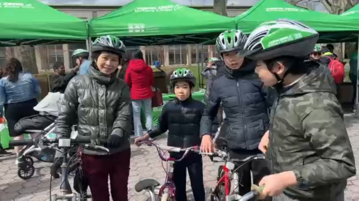 Con el fin de proteger a grandes ya chicos, el Concejal Francisco Moya entregó 1.000 cascos de bicicleta gratis en la Uniesfera del parque Flushing Meadows este sábado.