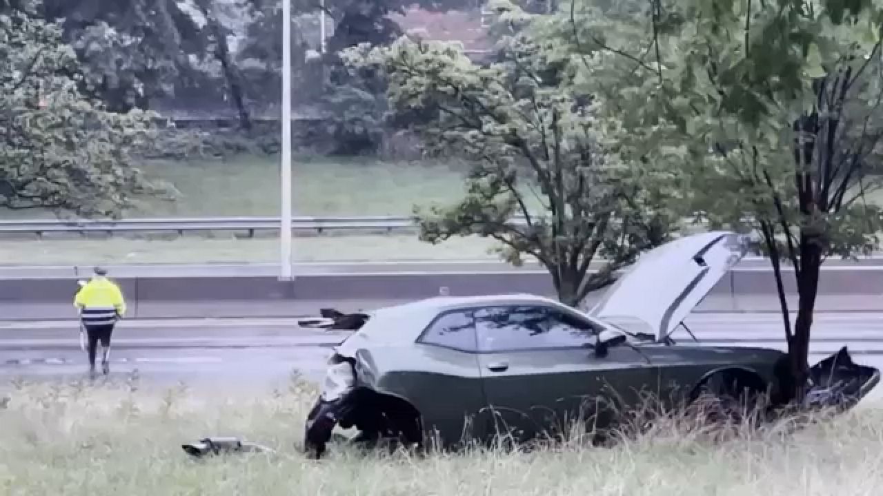 Posteriormente, el Dodge se desvió hacia el césped impactando contra el poste de una señal de tránsito, que hizo que el vehículo se partiera en dos.