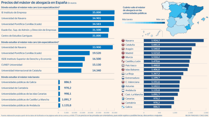 Salta a la vista, comparando los dos nichos, la diferencia de precios. Las universidades públicas tienen sus tasas topadas por ley, de forma que son las autonomías las que, cada verano, fijan los precios públicos de sus másteres. La región donde es más asequible estudiar el máster de abogacía es en Galicia (886 euros por máster). Por su parte, Navarra es la más cara (1.924 euros). Mientras que Madrid (1.523) y cataluña (1.661) se sitúan por encima del promedio (1.311 euros). Los precios no incluyen las tasas administrativas, como la apertura del expediente, los gastos de gestión o la retirada del título.