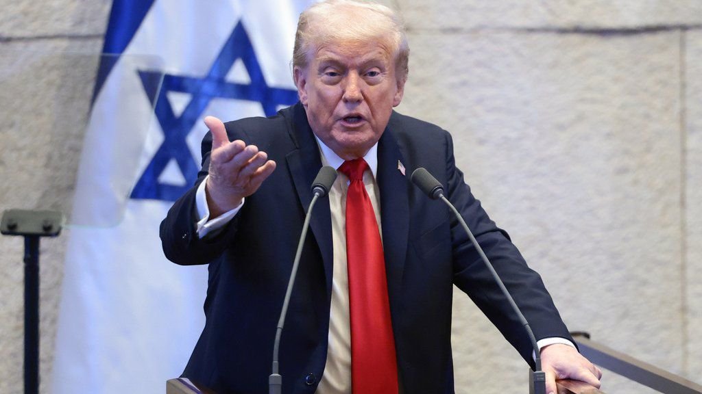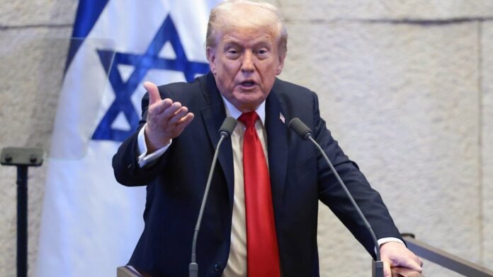 Amir Ohana, el presidente de la Knéset, dio la bienvenida a Trump al parlamento diciendo «hemos anhelado este día». Algunas personas en la galería llevaban sombreros rojos que decían «Trump, el presidente de la paz».