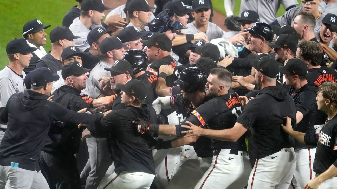 Con un out, el lanzamiento de Holmes golpeó a Kjerstad en la oreja. Después de una demora, Kjerstad pudo levantarse, pero abandonó el juego. Luego las cosas se intensificaron, con el mánager de los Orioles, Brandon Hyde, caminando hacia el dugout de Nueva York y señalando, momento en el que el receptor de los Yankees Pozos de Austin Intentó contener a Hyde, pero los bancos y los bullpens se vaciaron. Hyde fue expulsado.