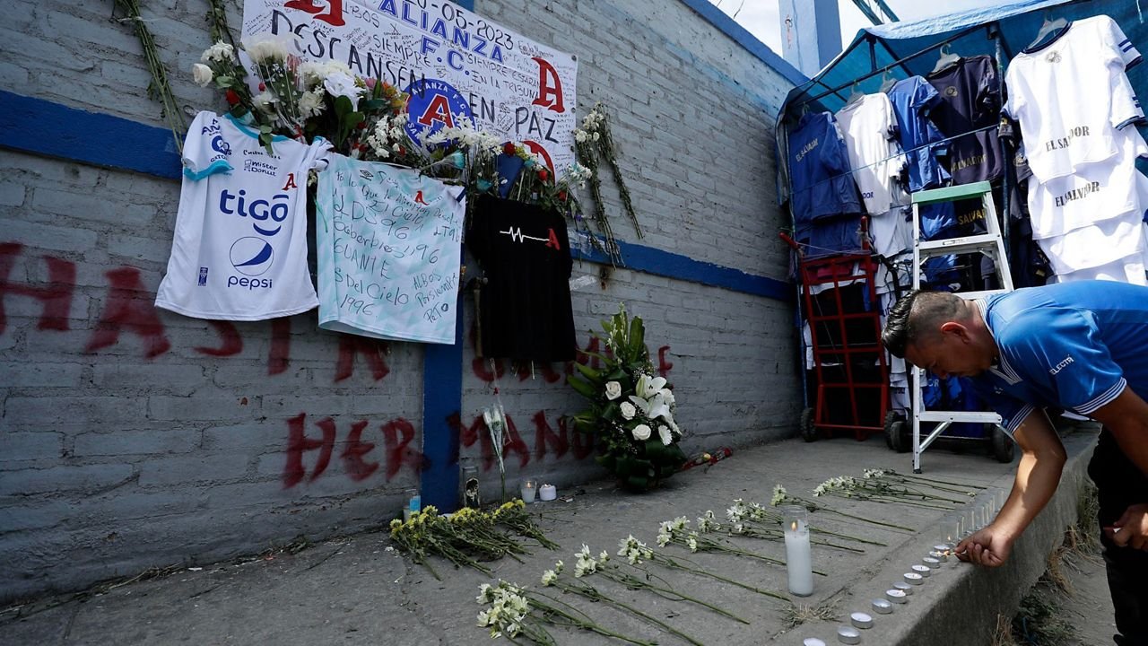 Flores, velas, camisas del equipo Alianza y una pancarta con mensajes para los aficionados fallecidos tras una estampida humana en el Estadio Cuscatlán en la capital de El Salvador, han sido colocados en las afueras del recinto deportivo como parte de un homenaje.