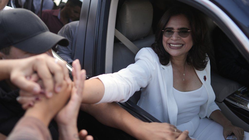 Rixi Moncada, candidata presidencial del gobernante Partido Libertad y Refundación (LIBRE), saluda a sus simpatizantes tras votar en las elecciones generales de Tegucigalpa, Honduras.(Foto AP/Emmanuel Andres)