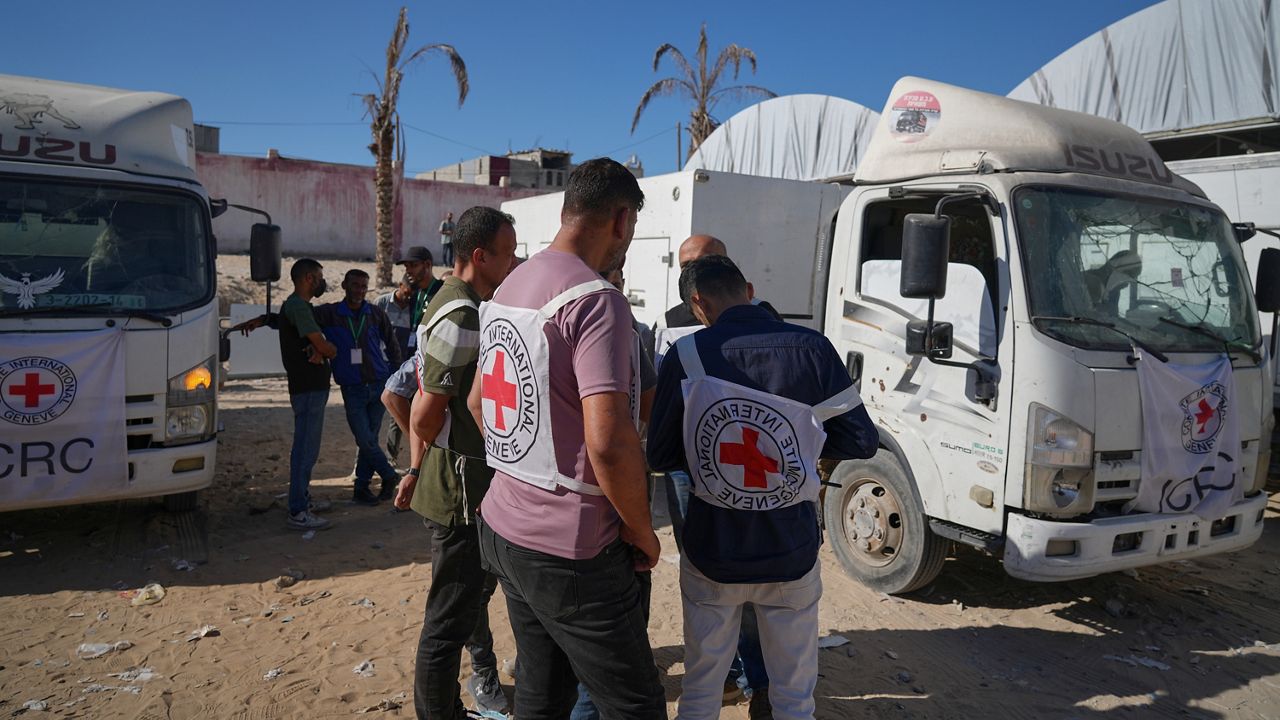 Vehículos de la Cruz Roja que transportan los cuerpos de palestinos fallecidos retenidos por Israel durante la guerra llegan tras su liberación al Hospital Nasser en Jan Yunis, al sur de la Franja de Gaza, el miércoles 15 de octubre de 2025. (AP Photo/Jehad Alshrafi)