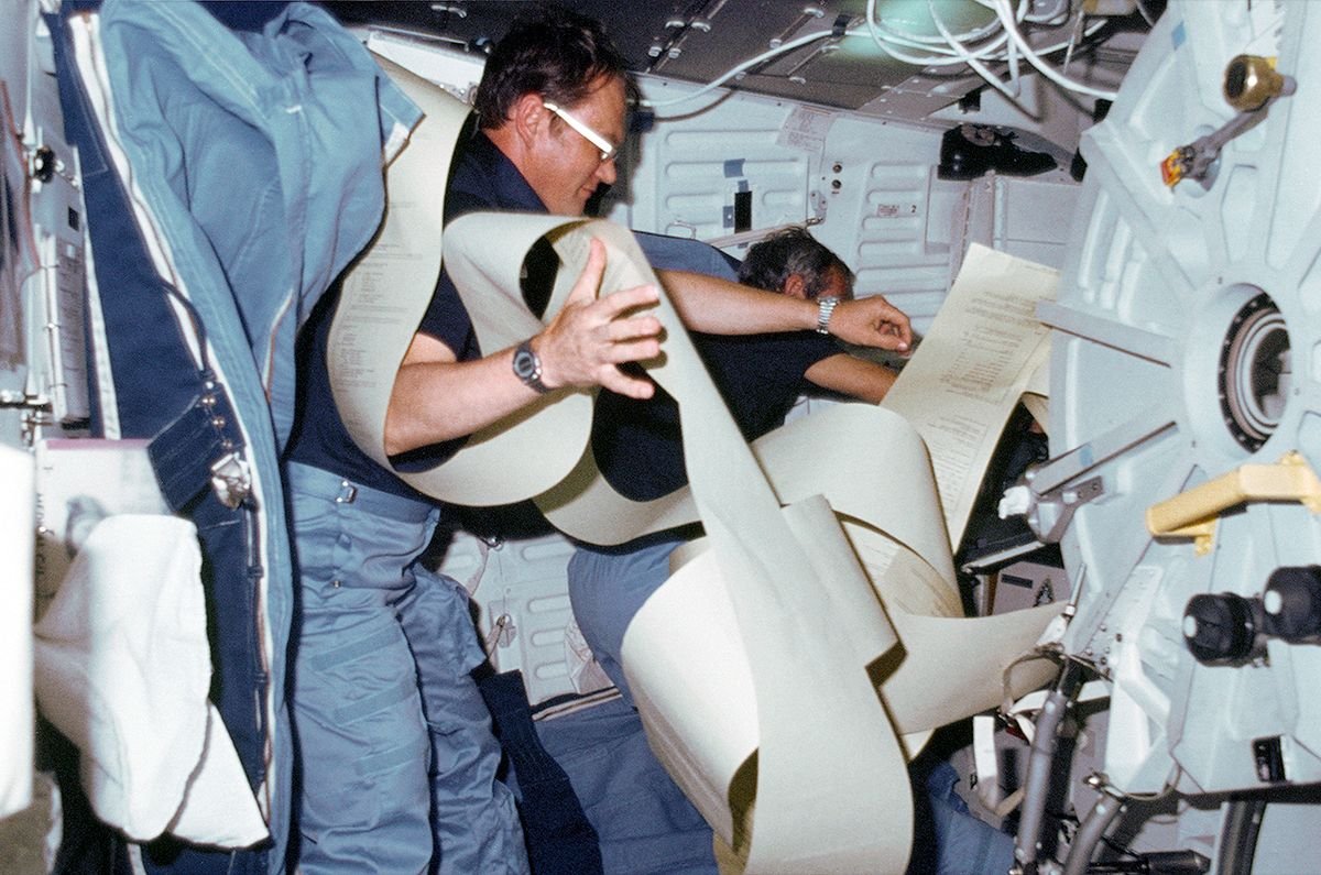 «Primer vuelo del Challenger. Primer peso ligero [external fuel] tanque. Bien, lanzamos el gran primer satélite, el TDRS [Tracking and Data Relay Satellite-1]», dijo Bobko, enumerando lo que distingue a STS-6 de otras misiones. «También fue el primer vuelo del HUD, la pantalla de visualización frontal, que tenía a mi lado. [of the flight deck].»