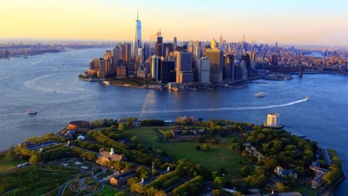 Los altísimos rascacielos de cristal, acero y hormigón se alzan sobre el puerto de color pizarra. Luego, solo ocho minutos después, llegas a tu destino: una isla de 70 hectáreas a solo 730 metros de la metrópolis más grande de EE.UU., y la ciudad se te va de la mente.