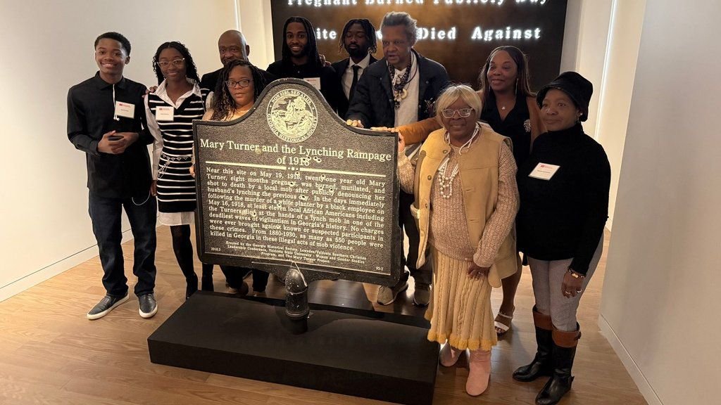Marcado con agujeros de bala y agrietado en su pedestal por un vehículo todoterreno, el marcador de la Sociedad Histórica de Georgia dice en parte: «Mary Turner, con ocho meses de embarazo, fue quemada, mutilada y asesinada a tiros por una turba después de denunciar públicamente el linchamiento de su esposo el día anterior. … Nunca se presentó cargos contra los participantes conocidos o sospechosos de estos crímenes. Desde 1880 hasta 1930, hasta 550 personas fueron asesinadas en Georgia en estos actos ilegales de violencia de turba».