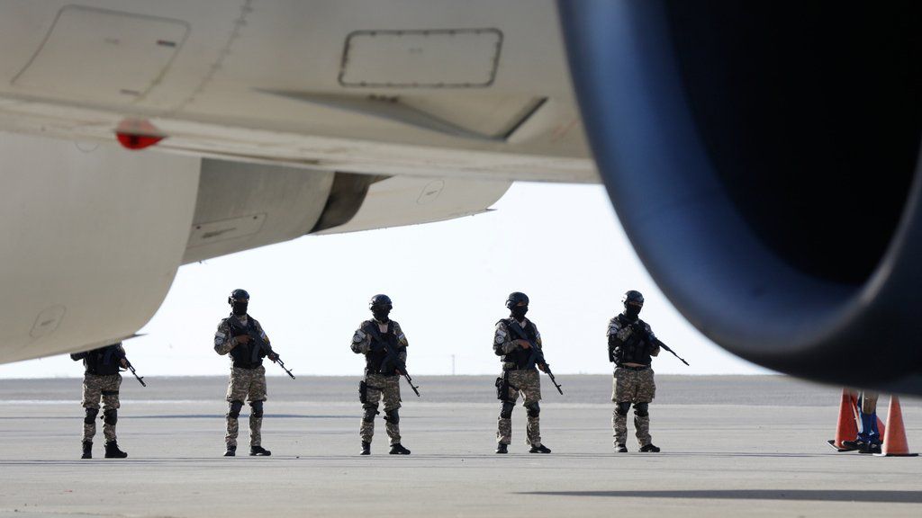 La policía monta guardia mientras un vuelo estadounidense que transportaba migrantes venezolanos deportados aterriza en el Aeropuerto Simón Bolívar de Maiquetía, Venezuela. (Foto AP/Cristiano Hernández)