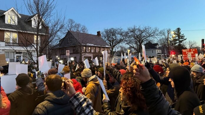 La gente protesta mientras los agentes del orden acuden al lugar del tiroteo en el que se vieron involucrados agentes federales, el miércoles 7 de enero de 2026, en Minneapolis. (Foto AP/Tom Baker)