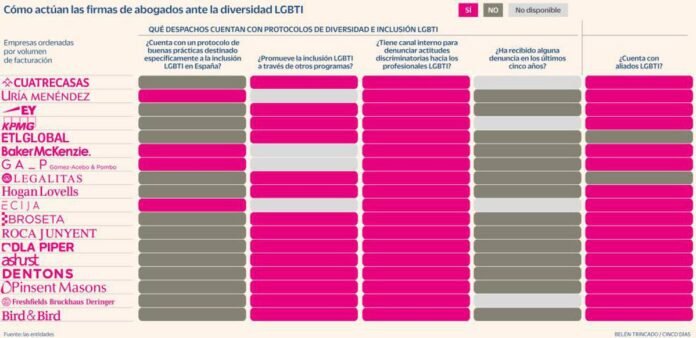 De la misma forma, estos despachos cuentan con canales internos para denunciar situaciones de acoso u otros comportamientos discriminatorios relacionados, entre otros motivos, con la orientación sexual, identidad de género (el concepto más interno de uno mismo) o expresión de género (la apariencia externa de la identidad de género). Salvo cuatro firmas que no han aportado información (como se ve en el gráfico que ilustra el reportaje), el resto no ha recibido denuncias en los últimos cinco años por discriminación o acoso LGBTI.