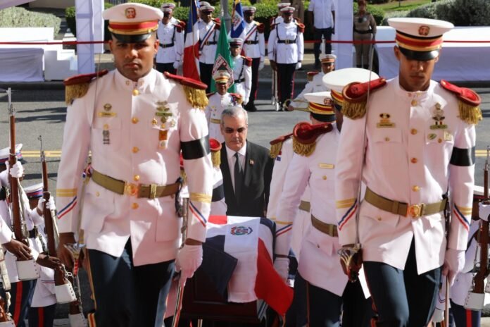 El Funeral de Estado inició a las 3:00 de la tarde en el Palacio Nacional, con el recibimiento de los restos del héroe y la llegada del mandatario, acompañado de la primera dama, Raquel Arbaje; la vicepresidenta, Raquel Peña; y diversos ministros y autoridades civiles, militares y eclesiásticas.