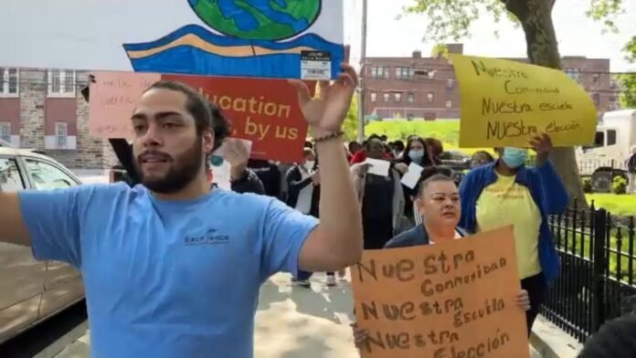 Estudiantes acompañados de sus padres y maestros salieron de sus salones de clase para manifestarse en contra de la mala acogida, que ha tenido la construcción de una escuela charter en el vecindario de Kingsbridge, en El Bronx.