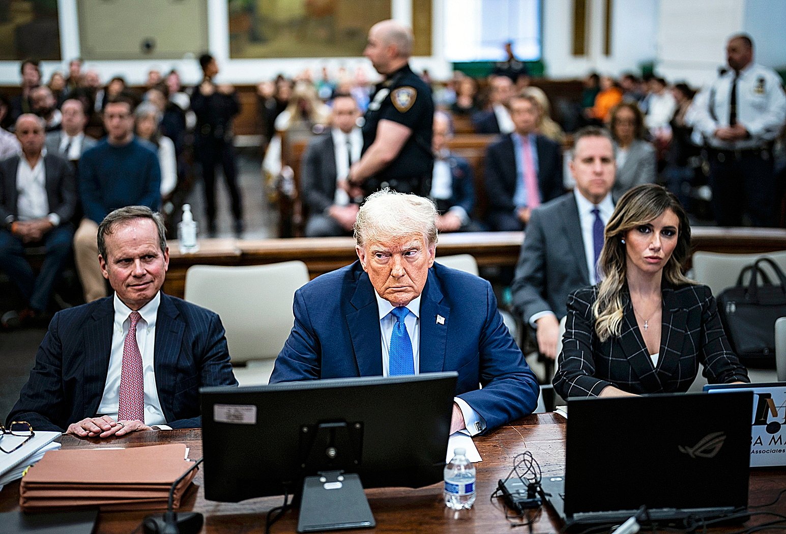 New York (United States), 06/11/2023.- Former US president Donald J. Trump (C) sits in the courtroom before testifying in the ongoing civil fraud trial being litigated in New York State Supreme Court in New York, New York, USA, 06 November 2023. Trump, his adult sons and the Trump family business are facing a lawsuit by the State of New York accusing them of inflating the value of assets to get favorable loans from banks. (Nueva York) EFE/EPA/JABIN BOTSFORD / POOL