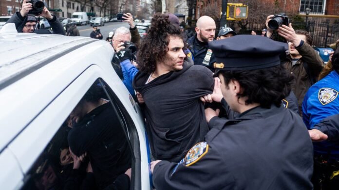 Emir Balat en el momento de ser detenido por la policía tras intentar detonar un artefacto explosivo frente a Gracie Mansión, el sábado 7 de marzo de 2026 en Nueva York. (Foto AP/Julius Constantine Motal)