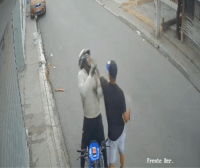 A través de una cámara de seguridad se observa cómo dos de los delincuentes interceptan al joven, lo golpean y, además del motor, le quitan sus pertenencias, mientras que los otros dos se estacionaron más adelante, vigilando el asalto.