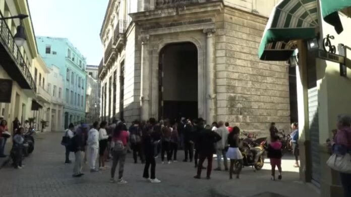 Los cubanos hacen fila para entrar en una panadería.