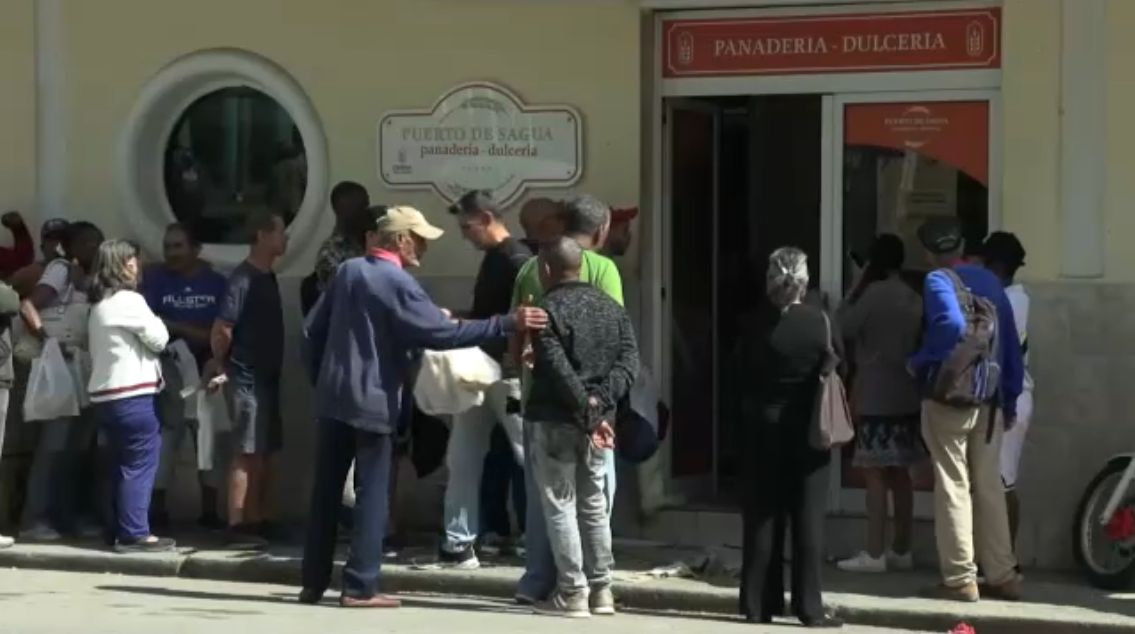 Los cubanos hacen fila para entrar en una panadería.