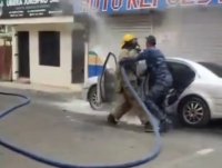 Un vehículo propiedad de un agente de la Policía Nacional se incendió mientras transitaba por la calle Palo Hincado, en el municipio de Hato Mayor. El hecho también dejó un momento curioso, ya que en medio del corre corre, el agente pedía a uno de los bomberos que no le echara mucha agua al carro. Al final, el bombero perdió la paciencia con el policía.